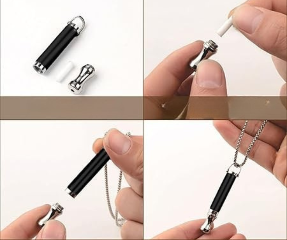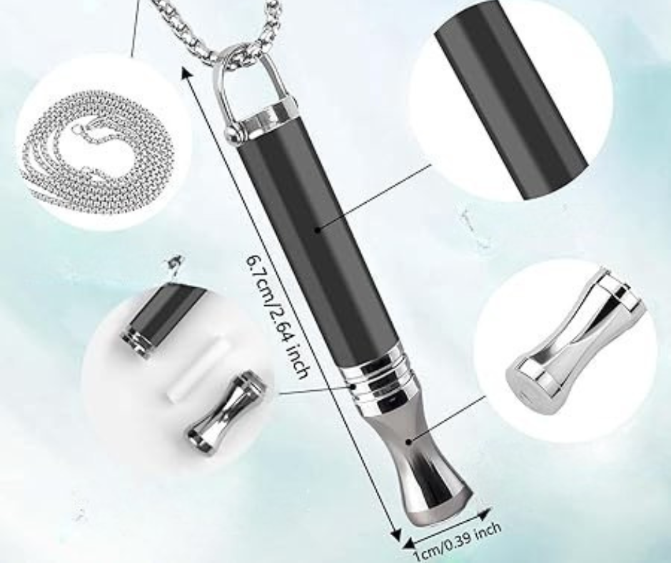 Gwizdek antynikotynowy umożliwia powolny, kontrolny oddech. Dzięki czemu pomaga przerwać impuls sięgnięcia po papierosa i uspokoić ciało w momencie napięcia. Jego lekka konstrukcja i łańcuszek sprawiają, że z naszyjnika oddechowego możesz wygodnie i wszędzie tam, gdzie potrzebujesz.